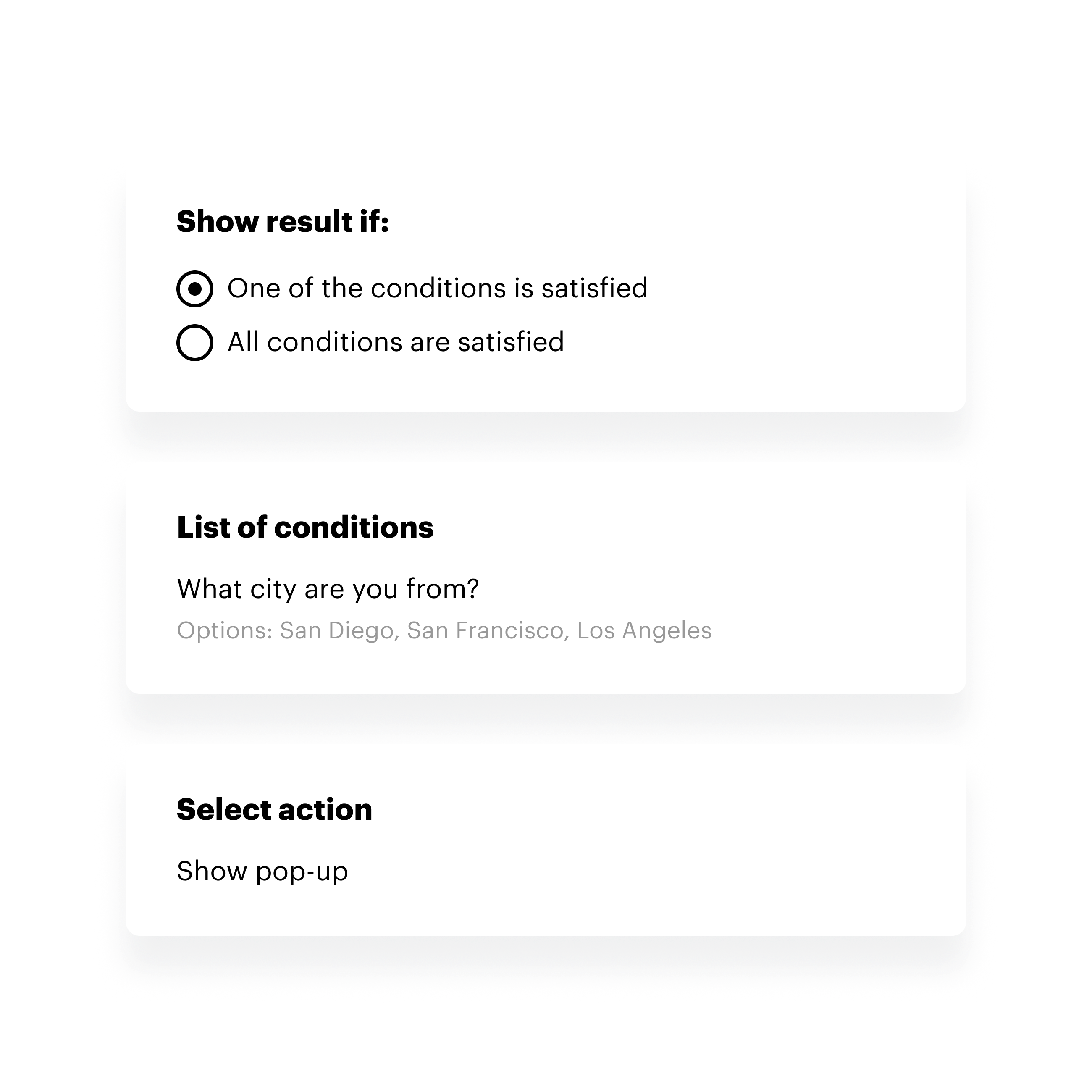Her ziyaretçi için quizleri kişiselleştirin: Verilen cevaplara bağlı olarak sorular sorun. Ziyaretçiler ilgisiz soruları yanıtlamak zorunda kalmaz ve siz de daha ayrıntılı bilgi edinirsiniz.